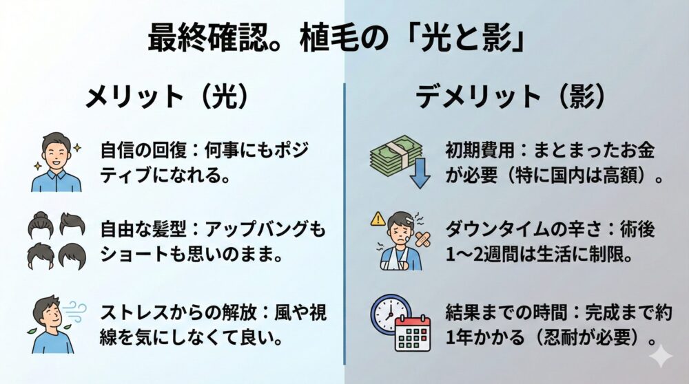 こちらは家族の理解を得ることにも関連しますが、植毛コストを生活費用以外から準備することが必要です。