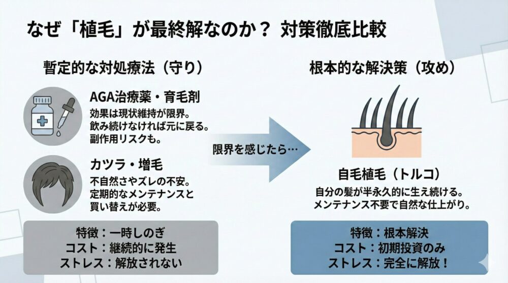 薄毛対策の現実的なオプションはAGA薬、自毛植毛、かつらになります。